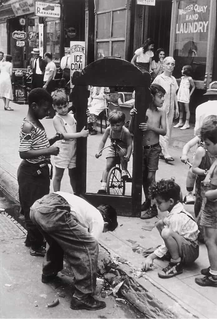 The photographer Helen Levitt captured this dynamic in her 1940s photographs of children on New York City streets. In “Children With Broken Mirror,” a group of children hold up an empty mirror frame while broken glass scatters around them. The risk is obvious—but they are completely absorbed in their game, fully present in their play.